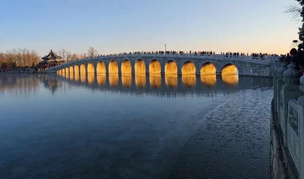 颐和园十七孔桥“金光穿孔”景不雅。