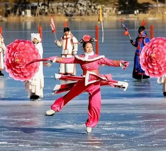 图为往年圆明园冰场的冰嬉饰演。