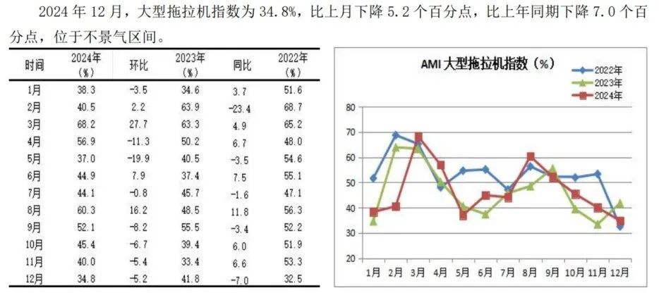 12月份AMI指数为39.4%,比上月下降0.5个百分点,比上年同时下降3.9个百分点。 中国农业机械畅达协会发布的2024年12月份中国农机阛阓景气指数(AMI)为39.4%,环比下降0.5个百分点,同比下降3.9个百分点。6个一级指数全部深陷不景气区间。从环比看,除司理东谈主信心指数小幅增长外,其它全辖下降。其中,效益、东谈主气指数降幅较大;从同比看,6个一级指数全线下行,其中效益指数、东谈主气指数降幅较大,分辩下降10.6%和8%,其它指数小幅下降。 特约分析师张华光以为:12月份动作全