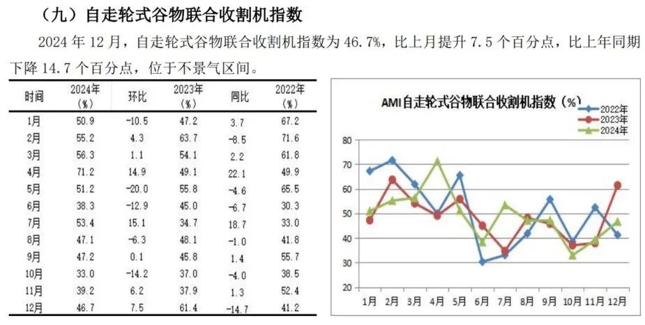 自走式玉米收成机指数。在环比资历“四连跌”、同比资历“三连跌”后,12月晦于走出收缩区间,插足推广区。12月,自走式玉米收成机指数环比大幅度增长16.5%,同比稳当增长7.3%,以45.8%的景气度收官。玉米收成机阛阓是2024年三大食粮作物收成机独一大幅度下降的阛阓,全年累计销售2.5万台傍边,同比大幅度下降35%以上。导致玉米收成机大幅度滑坡的主要原因是玉米价钱的大幅度下降访佛畜牧业心事性滑坡。但玉米收成机阛阓中的分支玉米籽粒收成机阛阓线路出宏大韧性,同比持续保抓稳当增长的势头,折射出玉米收成机阛阓需求结构插足深度治疗期。