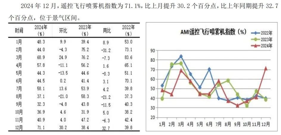 其四,田间解决机械指数希世之珍。淌若说12月也有好音讯,那等于田间解决机械带给咱们的几许安危。在所监测的5个二级指数中,环比“2上3下”,田间解决机械、收成机指数环比出现不同进度的增长,尤其是田间解决机械指数,环比大幅度汲引13.9%,同比汲引14.2%,并一举挺进景气区间,成为12月份二级指数中最靓丽的一谈阵势线。田间解决指数景气度的上佳线路主要得益于遥控飞行喷雾机指数的飙升,12月份,遥控飞行喷雾机指数环比飙升30.2个百分点,同比大幅度汲引32.7个百分点,以71.1%的景气度创下全年最高值,成为拉动田间解决机械指数的主要力量。