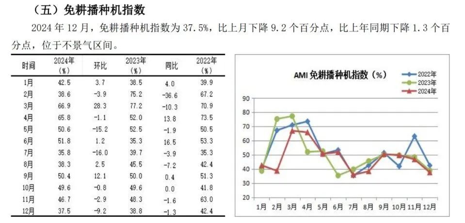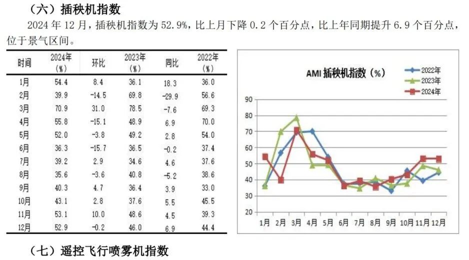 本年插秧机阛阓增势稳当。插秧机指数继11月份挺进景气指数后,12月份持续保抓推广势头,以52.9%的景气度收官,尽管环比下降0.2个百分点。同比增长6.9个百分点,意味着本年的阛阓好于客岁同时。插秧机的补贴计谋持续发力,行将启动的2025年,受插秧机单台补贴额度出现较大幅度下调的影响,坐褥企业、经销商收拢下调前的契机,加大促销力度,末端用户提前购买,成为鼓舞12月份插秧机指数增长的主要能源。另外,我国机插率偏低,飞腾空间大,刚性需求较为强盛,当成心条款出刻下,阛阓“乘计谋之风”启动是相宜发展逻辑的。