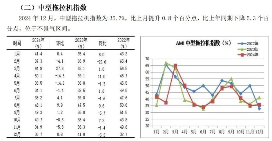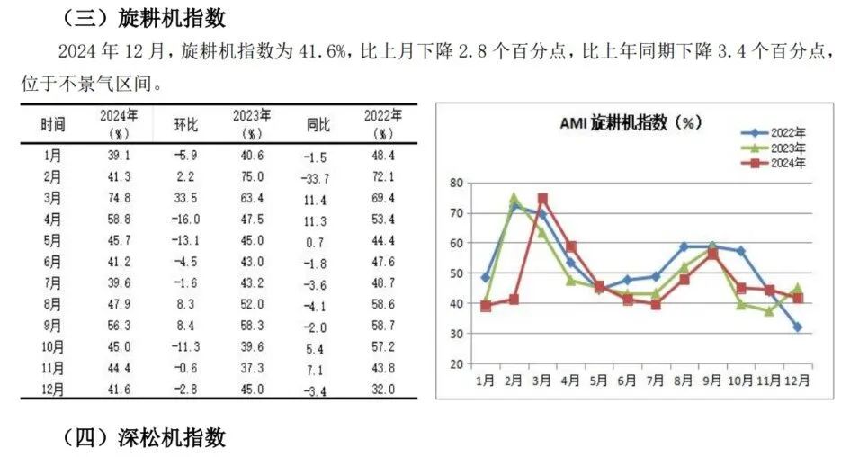 其一,景气度创全年新低。12月份,AMI以39.4%的景气度颓败收官,创下全年最低景气度。AMI下半年抓续低迷是多厚利空要素访佛酿成的。一是谷贱伤农。本年以来,粮价受阛阓供需关系、当然灾害、国外阛阓动态、计谋变化以及投契行为等多厚利空要素影响,抓续走低。既打击了农机阛阓耗尽信心,又松开了农民购买力;二是进口猛增,牛肉价钱跳水。本年出栏一头肉牛平均亏蚀1600元以上,连系8个月亏蚀朝上1000元。65%以上的衍生户处于亏蚀景况,我国畜牧业碰到前所未有的重创。与之关联的畜牧机械、饲料收成机械等阛阓随之出现断崖式下滑,成为压制12月AMI的又一进攻要素;三是季节要素。12月碰劲农机阛阓淡季,加之本年春节来得早,甚而淡季更淡。
