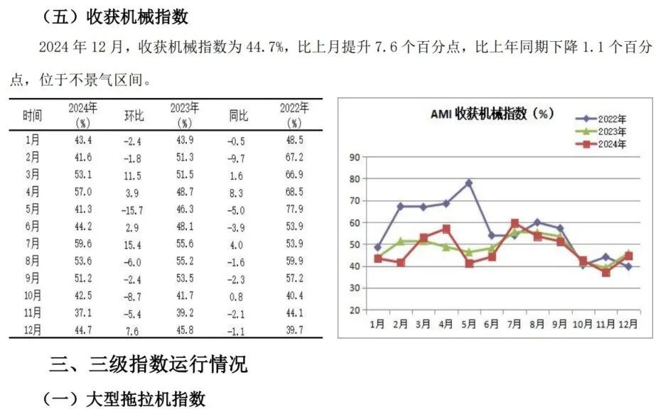 12月份,收成机阛阓碰劲传统销售淡季,持续保抓在收缩区间。在资历“四连跌”后,12月出现翘尾迹象,环比增长7.6%,以44.7%的景气度收官。但同比出现小幅下降,走出“两连跌”。