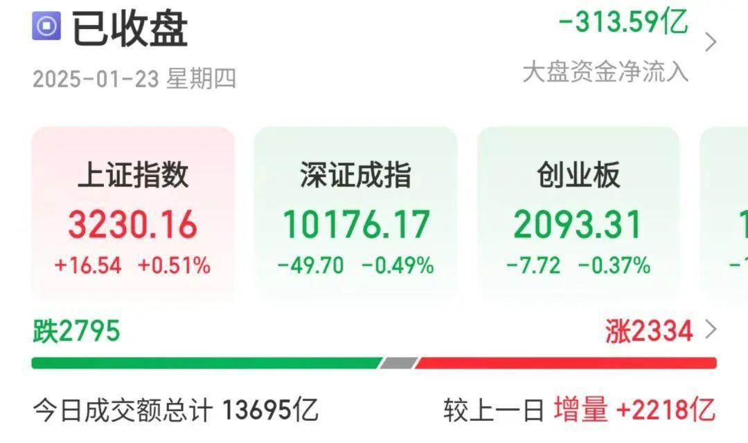 1月23日,A股三大指数冲高回落。限定收盘,沪指涨0.51%,深成指跌0.49%,创业板指跌0.37%,北证50指数跌0.02%。全市集成交额13695亿元,较上日放量2218亿元。全市集超2300只个股上升。