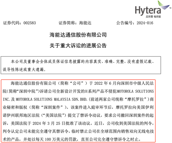 海能达于4月8日发布公告称,公司收到好意思法院的判令,临时辞让该公司在内行范围内销售双向无线电技能的居品,并处以每天100万好意思元的罚金,直至公司都备着力禁诉令。