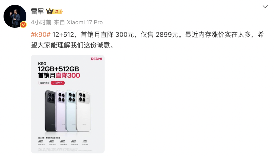 10月24日,界面新闻获悉,针对REDMI K90订价公布后不同版块价差过大的问题,小米集并吞伴东说念主、总裁卢伟冰在微博上示意,照旧看到了世界对K90圭臬版订价的驳倒,“来自上游的资本压力,着实的传导到了新品订价上。”
